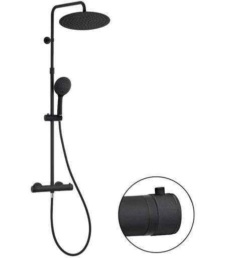 Points forts : Finition au choix/Mitigeur thermostatique/Tête de douche inox/Poignées en métal guilloché Colonne de douche ronde BRUMA : l'élégance fonctionnelle en version chromée ou noire La colonne de douche BRUMA allie design affirmé et confort d'utilisation pour une expérience quotidienne à la hauteur. Disponible en gris chromé ou en noir intense, elle s'adapte aux styles les plus contemporains comme aux salles de bains plus classiques. Sa barre en inox réglable de 80 à 120 cm vous permet d'ajuster la hauteur idéale à l'installation, tandis que sa tête de douche large Ø 30 cm en inox assure une pluie douce et enveloppante. Le tout est complété par une douchette à main 3 jets avec bouton de changement facile, pour varier les plaisirs d'un simple geste. Pensée pour durer, BRUMA dispose d'un mitigeur thermostatique avec corps anti-brûlures et double membrane isolante, idéal pour garder une température constante en toute sécurité. Les poignées guillochées en métal apportent une ...