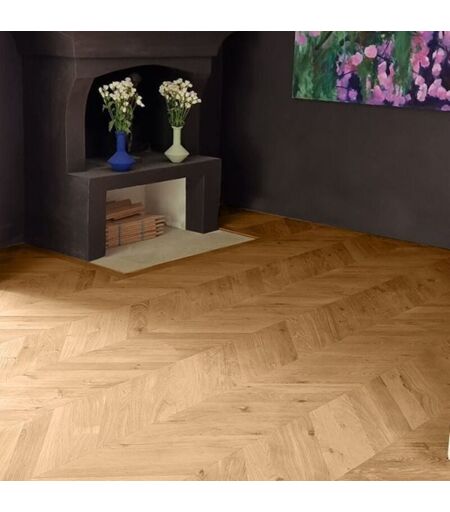 Parquet Point de Hongrie. Parquet en chêne massif fabriqué en France. Chêne français issu de forêts gérées durablement et certifiées 100% PEFC. Parquet vitrifié (verni) en teinte Naturel. Le choix Authentique - RT2 apporte toute la chaleur et la diversité du bois, avec toutes les singularités qui font cet aspect rustique : Noeuds, traces de coeur, d’aubier, couleurs vivantes, quelques piqûres, fentes et discoloration possible.Le bois dans toutes ses expressions. Livré rebouché et poncé. Comment poser le parquet ? Nous vous conseillons d’opter pour une pose collée. Le parquet peut être posé dans toutes les pièces de votre intérieur ; chambre, salon et même dans les pièces humides à condition qu’elles soient suffisamment ventilées et aérées. Si vous êtes à la recherche d’un parquet compatible sol chauffant, il conviendra sans aucun problème. Largeur des lames (en mm) : 85 Longueur des lames (en mm) : 500 Epaisseur des lames (en mm) : 13 Angle 50° Parquet verni : 2 couches ultra ...
