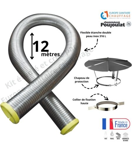 Poujoulat - Kit tubage flexible double peau inox diamètre 100 + collier de fixation haute + chapeau Longueur du conduit 12 mètres