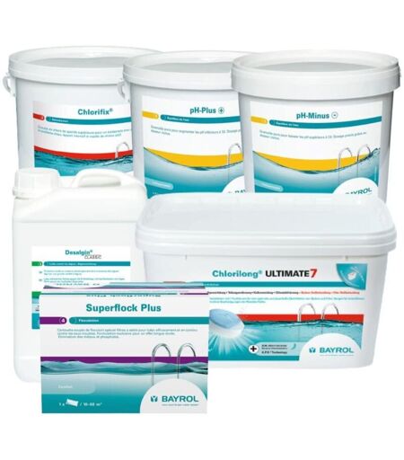 Bayrol - Pack produits Piscine 6 produits : 7 fonctions 4,8kg, Choc 5kg, pH plus 5kg, pH minus 6kg, Anti-algues 3L, Floculant x8