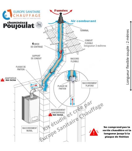 POUJOULAT Kit de raccordement pour évacuation des fumées, modèle C9, conçu pour les chaudières à condensation Longueur flexible 2 mètres