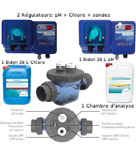 Fluidra - Pack Régulateur pH + Chlore astralpool + chambre analyse + 1 Bidon 20 l Chlore + 1 Bidon pH- 20 l bayrol