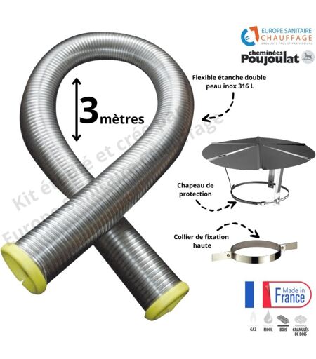 Poujoulat - Kit tubage flexible double peau inox diamètre 200 + collier de fixation haute + chapeau Longueur du conduit 3 mètres