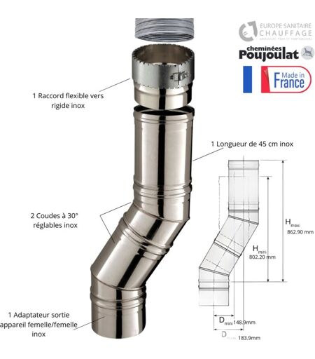 Kit de raccordement spécial insert et foyer avec raccord flexible - Kitinox Poujoulat Diamètre 150 Découvrez le kit de raccordement Poujoulat de la gamme Kitinox, conçu spécialement pour le raccordement des inserts et foyers à bois. Ce kit de haute qualité propose une solution rapide et efficace pour l'installation de systèmes de chauffage, garantissant une transition fluide entre un conduit flexible et un conduit rigide en inox. Les points forts du kit Kitinox : Adaptabilité optimale : Ce kit est particulièrement bien adapté pour le raccordement des inserts et foyers à bois, offrant une solution fiable et robuste pour ces types d'installations. Réglable en hauteur : Ajustable de 775 à 850 mm, il permet une adaptabilité maximale pour s'adapter aux configurations variées de vos installations. Dévoiement précis : Permet un dévoiement de 130 à 170 mm, idéal pour contourner les obstacles et adapter le conduit à l'espace disponible. Installation rapide et simplifiée : Constitue une ...