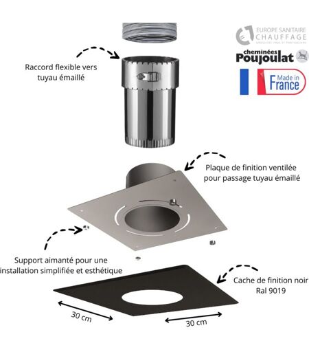 Kit raccord flexible + plaque de finition Poujoulat Diamètre 130 Ensemble plaque de finition intérieur + raccord flexible vers émaillé. Plaque de finition : Permet la finition et le passage d'un conduit émaillé en partie basse vers un raccord flexible dans votre conduit maçonné. La plaque de finition avec ventilation cachée est équipée d'une seconde plaque de propreté qui grâce à un astucieux support aimanté permet une finition parfaite sans aucune vis apparente. Section de la plaque : 30 x 30 cm Raccord flexible : Permet le raccordement d'un flexible existant sur un conduit rigide émaillé . Lors de la réception de votre commande, il est impératif de vérifier l'état de la marchandise en présence du livreur. En cas d'anomalie, émettez des réserves précises sur le bon de livraison ou refusez la marchandise. Sans cette vérification préalable, aucune réclamation ne pourra être acceptée. ...