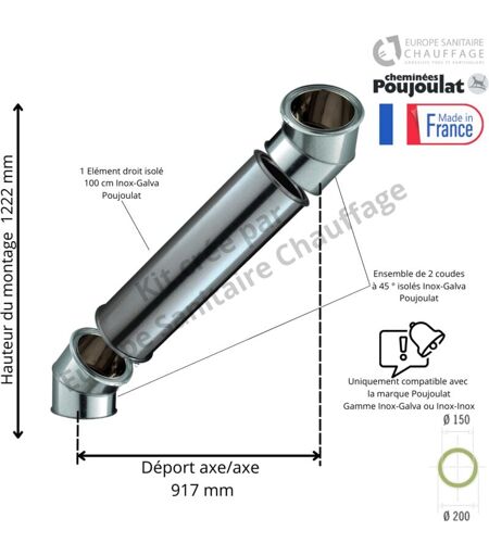Kit 2 coudes à 45 degrés + 95 cm Inox-Galva Poujoulat Diamètre 150 Kit 2 coudes à 45° + 95 cm Inox-Galva Poujoulat offre une solution efficace pour les installations de fumisterie. Ce kit, composé de deux coudes et d'un élément droit, assure une évacuation optimale des fumées tout en respectant les normes de sécurité. Il se distingue par sa compatibilité avec divers appareils de chauffage, sa facilité d'installation et sa conception robuste, garantissant ainsi performance et durabilité. 2 Coudes à 45° : idéaux pour les dévoiements nécessaires à l'installation. 1 Longueur de 95 cm : pour un ajustement parfait dans votre système. Caractéristiques techniques : Diamètre intérieur de 150 mm et extérieur de 200 mm pour un raccordement facile. Conception double paroi : paroi intérieure en Inox 304 pour une excellente résistance. Isolation en laine de roche : réduit les déperditions thermiques. Lors de la réception de votre commande, il est impératif de vérifier l'état de la marchandise en ...