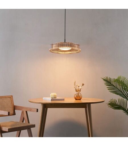 La suspension Damian, avec sa finition noire et son verre ambré cannelé, est un luminaire élégant qui modernise n'importe quel espace. Le verre ambré offre une atmosphère chaleureuse et conviviale, tandis que les motifs cannelés diffusent la lumière de façon délicate et esthétique. Idéale pour les cuisines et les salles à manger, cette suspension allie style raffiné et fonctionnalité. Elle est équipée de LED intégrées, offrant un éclairage blanc chaud (3000K). Damian est également disponible en version plafonnier. ) Assemblage simple requis ( ...