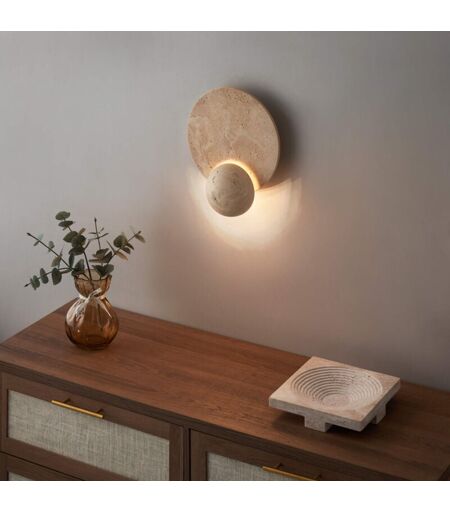L'applique murale Orsola, en travertin, se distingue par sa jolie couleur pierre clair et son éclairage tamisé. Composée d'un grand cercle de 22 cm de diamètre surmonté d'un cercle plus petit, elle offre un design élégant. Ses LED intégrées diffusent une lumière chaleureuse (3000K) de manière indirecte, idéale pour créer une ambiance douce. Orsola est parfaite pour éclairer un escalier, un couloir ou comme lumière de chevet dans une chambre. ) Assemblage simple requis ( ...