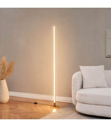 Sloane est un lampadaire en finition dorée au design simple et élégant, parfait pour un intérieur moderne. Sa structure élancée, d'une hauteur de 150 cm, repose sur un socle rond de 18 cm, offrant à la fois solidité et légèreté. Équipé d'une LED intégrée, il diffuse une lumière chaude de 3000K, idéale pour instaurer une atmosphère cosy dans un salon, une chambre ou un bureau. Grâce à son variateur de luminosité intégré, l'intensité de la lumière peut être ajustée selon vos envies. ) Assemblage simple requis ( ...
