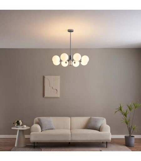 La suspension Nicolea se distingue par son design chromé et ses 8 globes en verre blanc, chacun recouvrant une douille G9 (ampoules non incluses). D'un diamètre de 77 cm, elle offre une hauteur ajustable pour s'adapter à différents types de pièces. Avec son allure vintage, Nicolea trouve parfaitement sa place dans des décors modernes ou classiques, et s'intègre à merveille dans une salle à manger ou un salon. ) Assemblage simple requis ( ...
