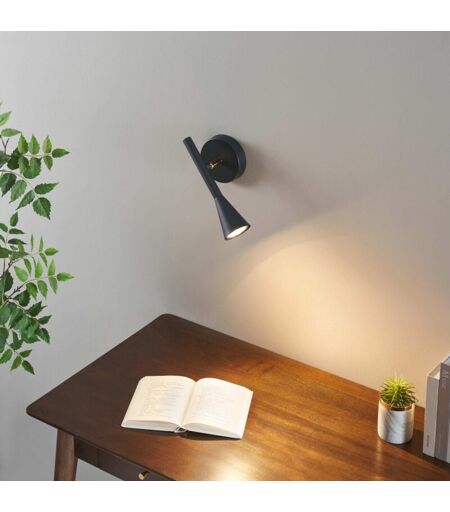 Sobriété et efficacité sont au rendez-vous avec Holen, une applique murale noire mate au style minimaliste. Sa tête conique orientable avec finition laiton permet un éclairage directionnel précis. À raccorder au mur, elle fonctionne avec une ampoule GU10 (non incluse). Idéale pour une chambre ou un espace de circulation. ) Livré monté, prêt à installer ( ...