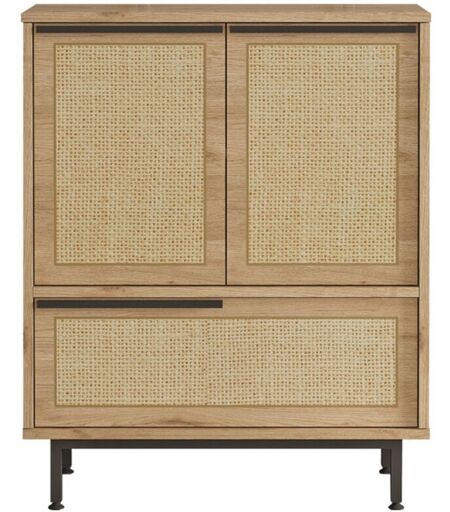 Caractéristiques techniques Couleur principale : Finition bois de noyer Couleur secondaire : Cannage Matériaux : Panneaux de particules mélaminés Piètement : Métal noir Rangement : 3 étagères Nombre moyen de chaussures : 9 paires de chaussures Entretien Pour préserver l'esthétique du meuble, un nettoyage délicat à l'aide d'un chiffon humide suffit. Evitez l'usage de détergents afin de préserver la finition des surfaces. Dimensions Dimensions totales (L x h x p) : 74.8 x 90.4 x 35.5 cm Hauteur étagère : 24.4 cm Hauteur piètement : 12 cm Poids total : 28.23 kg Conditionnement Le produit est conditionné dans 1 colis de : 41 x 86 x 22 cm / 28.17 kg Montage facile, une notice est fournie. ...