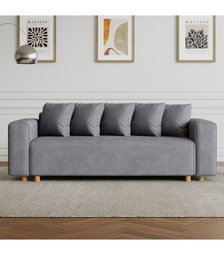 Canapé convertible 3 places en velours côtelé grisAssise généreuse et revêtement texturé : ce canapé 3 places incarne l'équilibre parfait entre style contemporain et confort du quotidien. Son velours côtelé apporte une touche chaleureuse et graphique à votre intérieur, tout en s'intégrant facilement dans une décoration minimaliste ou plus expressive.Pensé pour s'adapter à toutes les situations, ce canapé se transforme en un couchage d'appoint en un geste simple. Son assise ferme et accueillante repose sur un système de suspension de qualité, garantissant un maintien optimal aussi bien en position canapé qu'en version lit.Les cinq coussins moelleux complètent l'ensemble en apportant une flexibilité bienvenue : soutien du dos, confort sous les bras ou oreiller improvisé, ils vous accompagnent selon vos besoins du moment. Leurs housses déhoussables facilitent l'entretien tout en préservant l'esthétique du canapé.Ses accoudoirs amovibles et ses pieds en bois clair soulignent la silhouette épurée de ce modèle tout en affirmant un esprit fonctionnel et durable. Ce canapé s'installe naturellement au c?ur de votre salon pour créer un espace accueillant, modulable, et toujours prêt à partager vos instants de détente.Caractéristiques techniquesNombre de places : 3Couleur : GrisForme : DroitType : ConvertibleDensité : FermeRevêtement : Velours côteléAvec coussins : Oui, 5 coussinsStructure : Bois massif d'eucalyptus et panneaux de particulesPiètement : Bois massif d'hévéaGarnissage : Double épaisseur mousse haute densité 50 kg/m3 et 25 kg/m3 + ouate 150 g/m2Suspensions assise : RessortsSuspensions dossier : Sangles élastiquesNombre de pieds : 4Accoudoirs : AmoviblesCoussins déhoussables : OuiEntretienPour préserver la beauté du velours côtelé, utilisez un chiffon doux légèrement humide pour nettoyer la surface. Évitez les produits abrasifs ou à base de solvant afin de ne pas altérer le tissu. DimensionsDimensions canapé (l x P x h) : 213 x 83 x 82 cmDimensions canapé lit (l x P x h) : 213 x 127 x 44 cmProfondeur d'assise méridienne : 105 cm Profondeur d'assise : 47 cmHauteur d'assise : 44 cmEpaisseur coussin d'assise : 35 cmHauteur dossier : 16 cmEpaisseur dossier : 15 cmDimensions accoudoirs (l x h x L) : 17 x 54 x 77 cmHauteur pied : 7 cmPoids total : 66 kgConditionnementLe produit est conditionné dans 2 colis :Colis 1 : 187 x 85 x 38 cm / 55 kgColis 2 : 78 x 33 x 56 cm / 11 kgMontage facile, une notice est fournie. ...