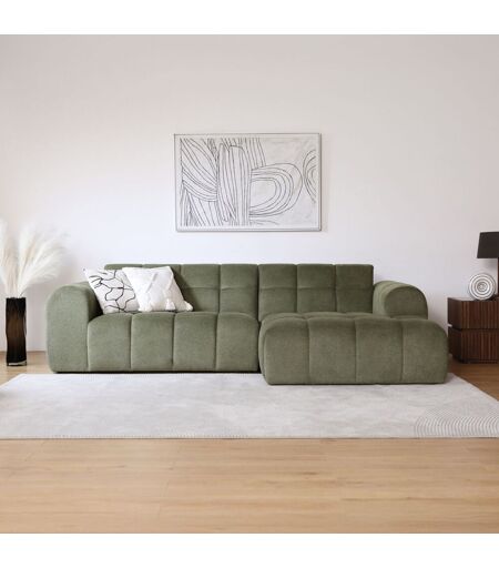 Canapé d'angle 3 places nuage en velours vertUn design généreux, tout en rondeur, pensé pour transformer votre salon en cocon de douceur. Avec ses volumes rebondis et sa silhouette enveloppante, ce canapé d'angle s'inspire de l'esthétique "bubble" pour apporter une note contemporaine et rassurante à votre espace de vie. Son tissu en velours doux au toucher capte la lumière avec élégance et réchauffe l'ambiance.La structure robuste en bois massif d'eucalyptus et les suspensions soigneusement travaillées assurent un maintien ferme et durable. L'assise profonde et dense invite à de vrais moments de détente, que ce soit pour un temps calme, une lecture prolongée ou une soirée conviviale. Chaque module a été conçu pour conjuguer confort et résistance au quotidien.La méridienne fixe à droite allonge la silhouette du canapé tout en vous offrant un véritable espace de relaxation. Grâce à ses finitions, elle se fond parfaitement dans le reste de l'ensemble, créant une continuité visuelle fluide et harmonieuse. Les accoudoirs galbés apportent une touche de douceur supplémentaire à ce canapé à la fois affirmé et accueillant.Pensé pour s'intégrer aussi bien dans un intérieur épuré que dans une décoration plus expressive, ce canapé devient un élément central autour duquel se créent vos instants de vie. Par sa présence, son confort et son allure contemporaine, il redéfinit les codes du salon chaleureux et design.Caractéristiques techniquesNombre de places : 3Couleur : VertForme : AngleMéridienne : DroiteType : FixeDensité : FermeRevêtement : VeloursStructure : Bois massif d'eucalyptus et panneaux de particulesPiètement : Bois massif d'hévéaGarnissage : Double épaisseur mousse haute densité 50 kg/m3 et 25 kg/m3 + ouate 150 g/m2Suspensions assise : RessortsSuspensions dossier : Sangles élastiquesNombre de pieds : 8Coussin décoratif non inclusEntretienPour préserver la beauté du velours, utilisez un chiffon doux légèrement humide pour nettoyer la surface. Evitez les produits abrasifs ou à base de solvant afin de ne pas altérer le tissu.DimensionsDimensions canapé (l x P x h) : 262 x 145 x 74 cmDimensions module méridienne : 116 x 145 x 74 cmDimensions module classique : 146 x 32 x 74 cmProfondeur d'assise méridienne : 115 cm Profondeur d'assise : 57 cmHauteur d'assise : 41 cmHauteur dossier : 32 cmDimensions accoudoirs (l x h) : 32 x 61 cmHauteur pied : 2 cmPoids total : 79 kgConditionnementLe produit est conditionné dans 2 colis :Colis 1 : 146 x 88 x 73 cmColis 2 : 145 x 117 x 73 cmMontage facile, une notice est fournie. ...