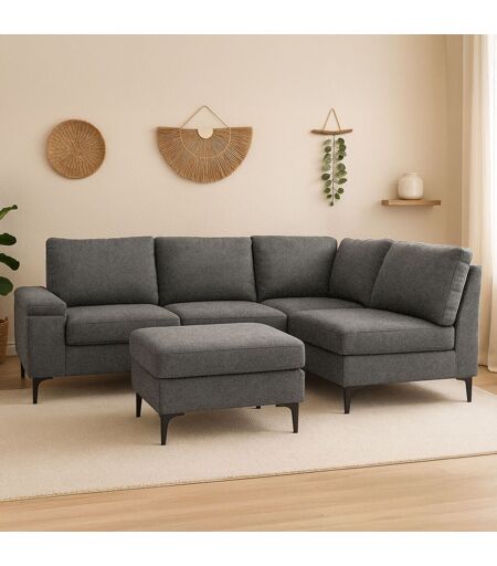 Canapé d'angle 4/5 places en tissu chenille gris anthracite avec poufEnvie d'un canapé aussi élégant que fonctionnel ? Craquez pour le KONEKT 3 places avec pouf, un modèle qui allie design contemporain, modularité astucieuse et confort durable.Grâce à son pouf modulable et à son angle réversible, le Konekt s'adapte facilement à votre espace et à vos envies du moment. Repose-pieds, méridienne, siège d'appoint ou petite table basse : son pouf multifonction vous accompagne dans toutes les configurations. Idéal pour un salon vivant, évolutif, et toujours accueillant.Avec sa teinte beige douce et lumineuse, il s'intègre harmonieusement dans tous les styles d'intérieur, du plus minimaliste au plus chaleureux. Et côté entretien ? Rien de plus simple : ses housses amovibles et lavables en machine vous permettent de garder un canapé propre sans effort. Un revêtement en tissu polyester agréable au toucher et facile à vivre, à nettoyer simplement avec un chiffon doux légèrement humide.Sa structure en bois massif garantit une robustesse à toute épreuve. Côté assise, le confort est au rendez-vous grâce à une mousse double épaisseur : une base ferme (28kg/m³) pour un bon maintien, surmontée d'une couche haute résilience (35kg/m³) pour une souplesse idéale. Résultat ? Une assise équilibrée qui invite à la détente, jour après jour.Pensé pour le quotidien, le canapé Konekt est convivial, pratique, et tout simplement confortable. Seul, à deux ou entre amis, il deviendra vite la pièce maîtresse de votre salon.Le Konekt, c'est un canapé conçu pour durer, évoluer et vous simplifier la vie.Confortable, moderne et généreusement dimensionné, ce canapé d'angle 4/5 places avec pouf s'impose comme un incontournable du salon. Son revêtement en tissu chenille, au toucher doux et à l'aspect texturé, crée une atmosphère accueillante et élégante.Pensé pour accompagner tous les moments du quotidien, il associe des lignes contemporaines à une assise de qualité. Le pouf indépendant permet de varier les configurations selon les envies : allonger l'assise pour un coin détente, créer une méridienne ou l'utiliser comme siège d'appoint pour les invités. L'ensemble offre un confort enveloppant.La structure repose sur un piètement fin au design mat, combinant métal et plastique pour plus de légèreté et de stabilité. L'assise est soutenue par des ressorts ensachés qui assurent un maintien durable, tandis que le dossier bénéficie d'une suspension par sangles élastiques pour un appui souple et agréable.Les coussins sont déhoussables, facilitant l'entretien au quotidien. Ce canapé modulable, spacieux et équilibré, est idéal pour créer un espace de vie fonctionnel, confortable et résolument contemporain.Caractéristiques techniques :Nombre de places : 4/5 placesCouleur : Gris anthraciteForme : AngleType : FixeRevêtement : Tissu chenilleStructure : BoisPiètement : Métal et plastiqueSuspensions assise : Ressorts ensachésSuspensions dossier : Sangles élastiquesNombre de pieds : 13Coussins... ...