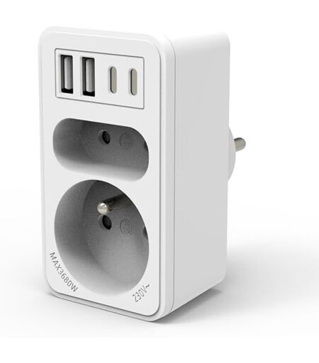 Transformez votre prise électrique classique en station de charge multimédia ! La Velamp biplite vous offre 2 prises électriques + 4 prises USB ! Les prises électriques sont de norme française : une grande 16A (2P+T) et une petite 6A. Charge maximale 3680W. Pour brancher deux appareils en même temps. 2 prises USB-A + 2 prises USB-C : pour connecter tous les appareils fonctionnant sur une prise USB : téléphone, réveil, tablette, lampe, radio, etc. Les prises USB-A sont de 5V 2.4A (12W) tandis que les prises USB-C sont de 5V 3A (15W). Plus besoin de chargeur ! Sans voyant lumineux, idéal pour les chambres. Pratique pour couvrir les besoins de branchement électrique domestique. Multiprise équipée d'une protection enfant. ...