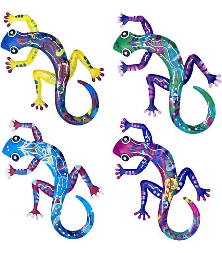 Lot de 4 décorations murales gecko en métal aux couleurs vives ¿ Sculptures de lézard durables pour extérieur/intérieur pour clôture, terrasse, jardin, décoration d'intérieur (bleu, violet, vert