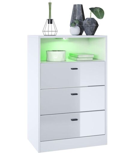 Espace de rangement La commode Buffet avec 3 tiroirs et un compartiment ouvert est un véritable génie en matière d'espace - toutes sortes d'objets peuvent être rangés bien triés dans les compartiments. Ouverture La commode est équipée de poignées noires discrètes, les tiroirs coulissent presque sans bruit sur des glissières à billes en métal. Les crochets muraux sont en plastique argenté. Design Le corps de la commode blanc mat et les façades en blanc haute brillance créent une moderne et chaleureuse. Vous pouvez choisir votre design préféré parmi de nombreuses autres combinaisons de couleurs. Matière Grâce à ses façades en MDF revêtues d'un film de haute qualité et à un caisson en panneaux de particules revêtus de mélamine, la table de chevet est agréablement légère et stable et de plus particulièrement facile à entretenir - finition de qualité Made in Germany Contenu de la livraison Sont inclus la commode Buffet, des instructions illustrées détaillées et le matériel de montage nécessaire. Montage rapide et facile garanti ! Dimensions approximatives de l'armoire de plancher (LxHxP) 56 x 86,5 x 36 cm ...