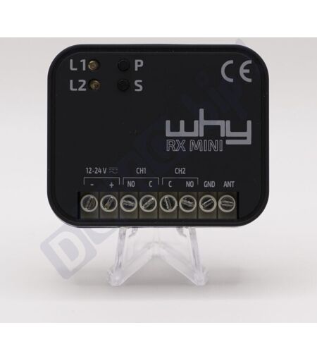 Récepteur universel multifréquence WHY RX MINI – Réf. 4790310 Description du produit : Le WHY RX MINI est un récepteur radio universel multifréquence ultra-compact, conçu pour centraliser facilement l’ouverture de portails, portes de garage ou tout autre système d’automatisation. Grâce à sa compatibilité étendue avec des centaines de modèles de télécommandes en 433,92 MHz et 868 MHz, il permet une gestion souple, sans avoir à modifier les installations existantes. Caractéristiques techniques : Alimentation : 12–24 V AC/DC Consommation : 20 mA typique, 50 mA max Nombre de relais : 2 relais indépendants Modes de fonctionnement des relais : Bistable (ON/OFF) Impulsif (par défaut) Temporisé en secondes (jusqu’à 255s) Temporisé en minutes (jusqu’à 255min) Fréquences prises en charge : 433,92 MHz et 868 MHz Nombre de codes mémorisables : jusqu’à 40 (1 bouton = 1 code) Dimensions : 53 x 76 x 24 mm Température de fonctionnement : de -20 °C à +70 °C Programmation facile : Deux modes ...