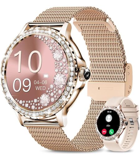 Montre Connectée Femme avec Diamants: La montre connectée pour femme dispose d'un écran HD de 1,3"" avec une résolution de 360 \u200b\u200bx 360 pour une expérience visuelle cristalline. La lunette est ornée de 60 diamants brillants, ajoutant à votre charme élégant à chaque mouvement. Vous pouvez personnaliser votre look avec une variété de cadrans de montre et changer entre des bracelets en acier inoxydable et des bracelets en silicone doux pour la peau pour correspondre à n'importe quelle humeur,Appel Bluetooth et Notifications: Cette montre connectée pour femmes est équipée d'une puce Bluetooth 5.2, vous permettant de passer et recevoir des appels, de recevoir des SMS ou des notifications de votre téléphone, de contrôler la lecture de musique. Avec cette montre, vous pouvez libérer vos mains et rester connectée tout en socialisant et vous divertissant. Vous ne manquerez plus jamais un message et vous n'aurez pas à sortir votre smartphone tout le temps,Surveillance de la Santé: Cette smartwatch femme peut détecter votre fréquence cardiaque, votre pression artérielle et votre oxygène sanguin pour mieux comprendre votre santé (non à usage médical). Le capteur de mouvement haute performance surveille automatiquement l'état du sommeil et fournit une analyse complète de la qualité du sommeil (sommeil profond, sommeil léger et éveillé). Vous pouvez également utiliser les fonctions Rappel de boisson et Rappel de sédentarité,Modes sportifs multiples: Les montres intelligentes fitness avec plusieurs modes sportifs : Course, Marche, Saut à la corde, Escalade, Yoga, Sit-ups, Cyclisme, etc. L'algorithme de données puissant peut également enregistrer avec précision le nombre de pas que vous faites chaque jour, les calories que vous brûlez et la distance que vous parcourez, puis les synchroniser avec l'application pour vous aider à élaborer un plan de fitness,Batterie longue durée & étanche IP68: Avec seulement 2.5 heures de charge, les montre connectée pour femmes peuvent atteindre jusqu'à 7 à 15 jours en veille ou 3 à 5 jours en utilisation, bien plus longtemps que la plupart des montres intelligentes. Elle prend également en charge la résistance à l'eau IP68, vous permettant de ne pas craindre l'eau lorsque vous vous lavez les mains, prenez une douche ou nagez, etc. (Veuillez faire attention à ne pas immerger la montre pendant une longue période.) ...