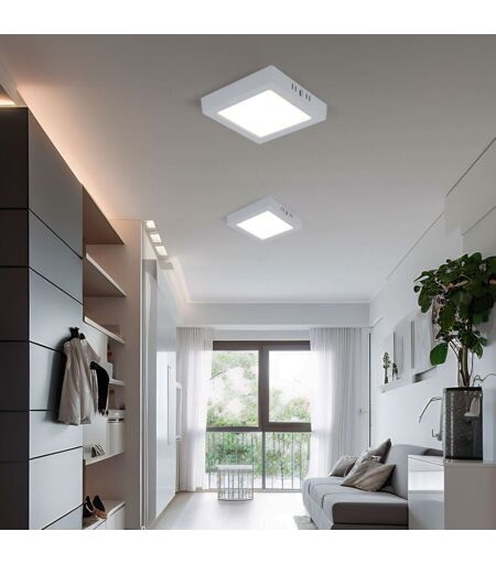 Description Panneau LED design pour montage au plafond. Le panneau LED de haute qualité peut être intégré dans presque tous les espaces de vie grâce à son design moderne et élégant. Le panneau LED est particulièrement adapté aux pièces telles que le couloir ou la cage d'escalier. Grâce à la source de lumière LED déjà installée, l'emplacement sélectionné est émis de manière optimale avec une puissance de 1 200 lumens. La source lumineuse LED est installée en permanence dans la lampe. Deux plafonniers sont inclus dans la livraison ! Détails lampe • Type de lampe : panneau LED • Matériau : plastique • Couleur blanche • Classe de protection : IP20 • Forme : carré • Longueur x largeur x hauteur en cm : 16,7 x 16,7 x 3,1 • Source lumineuse : 1x LED • Ampoules incluses : Oui (installées en permanence) • Puissance de la lampe : 1x 12 watts • Flux lumineux : 1x 1200 lumens • Couleur de la lumière : blanc chaud Détails des ampoules • Type d'ampoule : LED • Flux lumineux : 1200lm (lumens) • ...