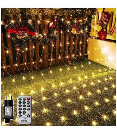 Guirlande Lumineuse Filet 200 LEDs 3M x 2M Instruction de réglage de la minuterie Appuyez sur le bouton pendant 3 secondes pour régler et réinitialiser la minuterie, la lumière verte du transformateur s’allumera;puis la guirlande lumineuse sera allumée pendant 6 heures et éteinte pendant 18 heures. Dans le cas où l’alimentation est maintenue, le mode de la fonction de temporisation est automatiquement activé, si l’alimentation est coupée, la minuterie doit être réinitialisée. Les perles de lumineux sont enfilées pour former une grille et nous pouvons facilement couvrir des buissons ou des tentes pour une installation rapide. Emballage inclus 1* Lumineuse Nettes Extérieure 1* Télécommande 1* Prise basse tension 31V 1* Manuel produit + produit Bouton de contrôle Ce rideaux lumineux a 4 niveaux de luminosité(25%,50%,75%,100%), Appuyez brièvement sur le bouton pour définir 8 modes d’éclairage. 8 modes 8 Modes & Fonction de Mémoire: Combinaison, vagues, changement continu, lueur lente, ...