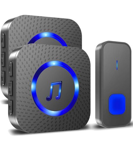BLEOSAN Sonnette sans Fil 300M Longue Portée Étanche Carillon Electronique 55 Mélodies 5 Niveaux Volume led Bleu 1 émetteur + 2 récepteurs
