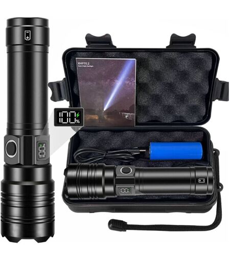 Lampe Torche LED Ultra Puissante 50000 Lumens Rechargeable Tactique Militaire IP67 Zoomable 5 Modes pour Camping Randonnée Urgence Lampe Torche LED Ultra Puissante Lampe de poche ultra puissante équipée d’un faisceau LED 30W amélioré, produisant jusqu’à 500000 lumens. Le projecteur est destiné aux grandes surfaces et la lampe d’appoint aux longues distances. Cette lampe de poche peut également se concentrer sur des objets jusqu’à 1000m de distance. + produit Port de charge USB C pour une charge rapide et fonction d’alimentation pour charger votre appareil en cas d’urgence. Cinq modes d’éclairage utiles pour répondre à vos besoins d’éclairage quotidiens, appuyez longuement pendant 3 secondes pour éteindre la lampe de poche dans n’importe quel mode. Caractéristiques Ultra Puissante Améliorée LED Puce: Lampe torche rechargeable dispose de la dernière puce améliorée PHM-30W LED avec une haute luminosité et une très longue portée. La mise au point peut être ajustée de étroite à large, avec ...