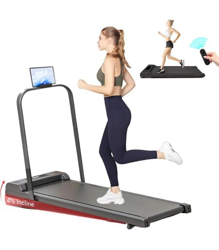 Tapis de Marche Tapis de Course Inclinable Pente 4% Vitesse 1-10km/h Gris Moteur 750W Télécommande Pente 4% 10cm Manuel BELOSAN Tapis de Course Pliable avec Poignée et Support pour Tablette Caractéristiques: Tapis de courses contrôlée par télécommande Moteur puissant et silencieux de 2.0 CV Plage de vitesse de 1 à 10 km/h Capacité de charge maximale de 120 kg Un écran LED qui vous permet de suivre la vitesse, la distance, le temps et les calories en temps réel + produit Spécifications: Matériel:ABS + Acier Taille de bande de course:103x39cm Affichage LED;Temps, Caloris, Distance Moteur:0.75HP Vitesses:1-10KM/H Support Maximum:120kg Dimensions Produit:121 x 55 x 95 cm Une zone plus large pour courir, la largeur de bande est 39cm Affichage LED Moteur puissant et silencieux Caractéristiques 2 en 1 Tapis de Course Pliable avec Poignée et Support pour Tablette:Ceci est le tout nouveau modèle amélioré de notre tapis de course 2-en-1, offrant polyvalence, compacité, flexibilité, efficacité, ...