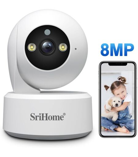 Caméra Surveillance 4K 8MP WiFi, Caméra Interieur 360° 2.4G/5GHz WiFi, Détection Mouvement Audio Bidirectionnel Vision Nocturne Caméra Surveillance 4K 8MP Caméra Intérieure Ultime pour une Protection Avancée En plus de ses capacités de rotation, la caméra peut surveiller efficacement le long d’itinéraires de patrouille uniques. Doté d’un bouton physique innovant, elle assure une connectivité constante et fiable entre les membres de la famille, et un appel peut être lancé en appuyant sur le bouton. + produit SUIVI AUTOMATIQUE DES PERSONNES ET ALARME SONORE/LUMINEUSE Dual bande de signal Wifi 5G/2.4G Facile à installer 24/7 enregistrement avec un stockage de 256G Caractéristiques SUPER FHD 8MP & VISION NOCTURNE: avec SUPER FHD 8MP et zoom numérique 3X, la caméra de surveillance Srihome wifi capture chaque détail clairement et vous permet de zoomer pour voir les détails qui vous intéressent le plus. La coupe intégrée d’ir apportent une excellente vision nocturne et aucune couleur coulée ...