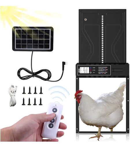 Porte Poulailler Solaire Automatique en Aluminium Avec un Panneau Solaire Minuterie écran LED Télécommande Deux Méthodes De Charge Porte Poulailler Solaire Automatique Porte Poulailler Solaire Automatique Noir 36.2×27.5×3.82cm + produit Porte contrôlée par la télécommande incluse Porte Contrôlée manuellement Caractéristiques La taille globale de la porte poulailler automatique solaire est de 36,2*27,5*3,82cm, et la taille du poulet à travers la porte est de 28cm*24cm, ce qui convient à toutes les tailles de volailles pour passer, y compris les canards, les poules, les poussins et les animaux plus grands. Porte Automatique Poulailler Solaire Batterie intégrée de 2000mAh, supporte la charge Type-C, peut être utilisée pendant deux mois après avoir été complètement chargée, supporte également la charge solaire, respectueuse de l’environnement et sans pollution. Suggestion:Installer le panneau solaire dans un endroit avec la lumière directe du soleil pour garder l’efficacité de charge. ...