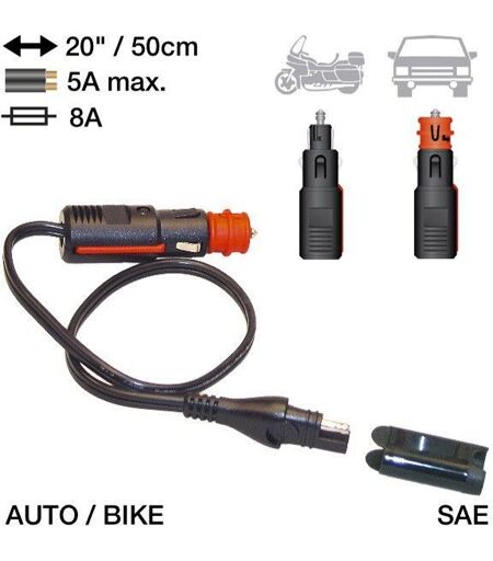 Chargeur de batterie tout type démarrage / décharge lente / VRLA Amps DC 5 Connector 1 SAE Connector 2 AUTO / MOTO degré d'utilisation -20°C Fusible 8 A Longueur cable 20 / 50CM Marque TECMATE ...