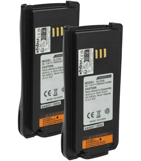 vhbw - the clever way - Batterie de rechange de haute qualité avec une grande autonomie et compatible avec votre radio talkie-walkie (vous trouverez ci-dessous tous les modèles correspondants) - La batterie peut être chargée avec le chargeur standard ou un chargeur compatible - Nos batteries répondent à toutes les normes de sécurité actuelles CONTENU DE LIVRAISON : - 2x batterie DONNÉES TECHNIQUES : - Technologie : Li-ion - sans effet mémoire - Capacité : 2000 mAh - Tension : 7,4 V - Énergie nominale : 14,8 Wh - Couleur : noir - Nombre de cellules : 2 - Matériau : plastique - Poids : 102 g COMPATIBLE AVEC HYT PD-708, PD70XG, PD780, PD-780, PD706V-1, PD70X, PD706U-1, PD706U-2 Pour garantir la compatibilité, veuillez vérifier si votre batterie utilisée actuellement est répertoriée. REMPLACEMENT POUR : - BL2006, BL2006Li, BL2008, BL2503, BL2008, BL2503, BL2006, BL3001 vhbw - Accessoires et pièces de rechange de haute qualité pour prolonger la durée de vie de vos appareils électriques. ...