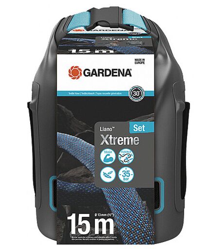 Kit complet comprenant un tuyau textile ultra résistant de 15 m et un sac de rangement, parfait pour les séances d'arrosage longues et difficiles • Utilisez le kit Liano™ Xtreme 15 m pret a l'emploi+ sac de rangement de GARDENA pour les séances d'arrosage longues et difficiles • Avec une longueur de 15 m et un diametre de 13 mm (1/2"), ce tuyau résistant est idéal pour les petits jardins • Le kit se compose du Liano™ Xtreme, des pieces préassemblées de l'Original GARDENA System, d'un raccord Liano™, d'un raccord aquastop, d'une lance de nettoyage, d'un sac de rangement pratique et de deux nez de robinet • Grâce au joint réducteur intégré dans l'un des deux nez de robinet, vous pouvez raccorder le tuyau textile a trois tailles de robinet au total • Le Liano™ Xtreme impressionne par ses performances optimales, sa flexibilité et sa durabilité, qu'il doit a son tuyau intérieur en PVC tres flexible et a son tuyau extérieur innovant en fibres tissées extremement résistantes • Grâce a sa durabilité et a sa surface antisalissure, il maîtrise les terrains accidentés tels que les épines des rosiers, les pavés... • Non seulement il est protégé des aléas extérieurs, mais il ne se plie pas • En outre, il peut etre facilement guidé autour des obstacles • Grâce a sa bonne haptique et a son faible poids, il offre une manipulation agréable • Il est jusqu'a 50 % plus léger que les tuyaux en PVC classiques • Cela est particulierement utile pour les longues sessions d'arrosage • Le sac inclus vous permet de ranger le tuyau de maniere peu encombrante • Vous pouvez donc facilement mettre le tuyau sur une étagere ou dans le garage • Le sac de rangement au design réussi simplifie le transport et présente des caractéristiques pratiques • Le sac est équipé d'un fond étanche et la fente d'aération permet a l'humidité de s'échapper • Les deux poches latérales permettent de ranger les accessoires du tuyau, comme la lance de nettoyage • Le tuyau a une pression d'éclatement de 35 bar • Il est tres résistant aux UV et au gel et peut etre laissé dehors toute l'année • De plus, le Liano™ Xtreme est exempt de substances nocives et donc exempt de phtalates (<0,1%) et exempt de cadmium, de plomb et de baryum (<0,1%) Caractéristiques techniques • Pression d'éclatement : 35 bar • Contenu : Complete with Original GARDENA System Parts, Spray Nozzle and Tap Connectors 18225/18220 and Liano™ storage bag • Longueur du tuyau : 15 m • Diametre du tuyau : 13 mm> ...