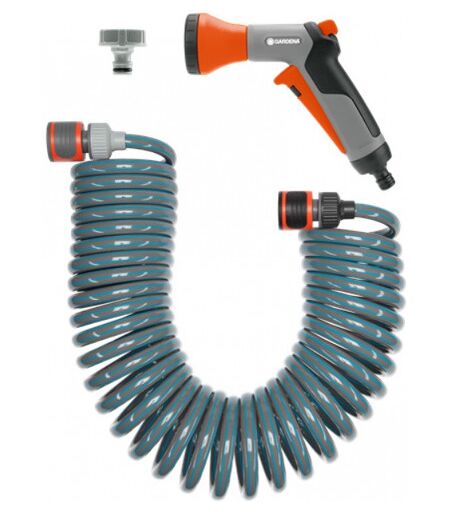 Flexible d'arrosage 10 m - GARDENA • Longueur du tuyau 10 m • Diamètre du tuyau 9 mm • Le Flexible d’arrosage 10 m GARDENA est idéal pour l’arrosage de plantes en terrasse, sur balcon ou dans les petites superficies telles que les jardinets sur rue • Grâce à l’enroulement en spirale, le tuyau se rétracte automatiquement • Livré avec 1x raccord rapide, 1x raccord Aquastop, 1x pistolet d’arrosage, 1x nez de robinet • Adaptateur 33,3 mm (G1’’) avec adaptateur 26,5 mm (G3/4’’)> ...