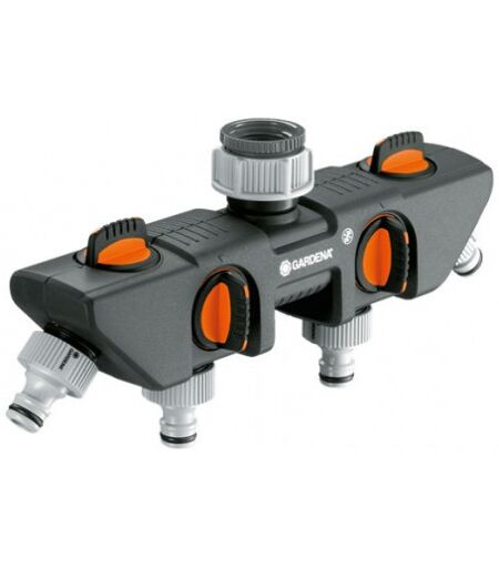 Sélecteur d'arrosage 4 voies - GARDENA • Utilisation - créer 2 réseaux à partir d'un point d'eau, 2 sorties réglables en continu • Le sélecteur d'arrosage 4 voies GARDENA permet de créer 4 réseaux à partir d’un point d’eau • Il permet de brancher par exemple 4 programmateurs d’arrosage ou minuteries GARDENA • Le débit d’eau est réglable et blocable • Convient pour des robinets 26,5 mm (G 3/4") avec filetage 33,3 mm (G 1’’) ou robinets 21 mm (G 1/2’’) avec filetage 26,5 mm (G 3/4’’)> ...