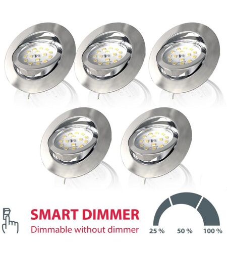 B.K.Licht I Luminaire LED encastré I Gradable à 3 niveaux par interrupteur mural I Ø 68 mm perçage I Set de 5 I 5x 5,5W module LED I 5 x 470lm I Orientable I 3.000K blanc chaud I IP23 I Ultra-plat I Nickel mat Ces luminaires LED encastrés orientables se présentent dans un design sobre, agréablement moderne et discret. Les luminaires encastrés sont des diffuseurs de lumière universels qui peuvent être installés dans les pièces à vivre, la cuisine, le couloir ou la cage d'escalier. Ils sont livrés avec des ampoules LED blanc chaud à faible consommation d'énergie. Le cadre de couleur nickel mat du luminaire encastré Pegasus est conçu de manière à ce que la source lumineuse puisse être orientée. Vous pouvez ainsi mettre en lumière les endroits les plus intéressants de votre maison. Avec une profondeur d'encastrement de 30 mm, Pegasus fait partie de ce que l'on appelle les spots encastrés ultraplats. Ils peuvent être installés dans des plafonds dont la hauteur de suspension est nettement ...