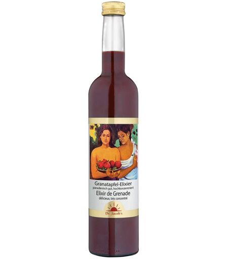 Concentré doux en polyphénols de grenadeChaque bouteille de Dr. Jacob’s Elixir de grenade contient le jus et la pulpe de plus de 50 grenades mûries au soleil, fraîchement pressées, sélectionnées avec soin et enrichies de polyphénols bioactifs fermentés et vivants de grenade.Une portion (10 ml) fournit environ la même quantité de polyphénols qu’un verre de jus de grenade (250 ml).**Résultats des analyses réalisées par des laboratoires alimentaires accrédités en Allemagne, tels que: Elixir de grenade - Eurofins, 19.08.2014, lot G275: 44,3 g/l de polyphénols totaux (équivalent acide gallique).Fischer-Zorn M, Ara V (2007): Jus de grenade - Composition chimique et éventuelles falsifications. Fruits liquides ; 08: 386-393.Dr. Jacob’s Elixir de grenade – Les avantages:Haute qualité: contrôle régulier de la teneur en polyphénols et tests stricts des résidus de pesticidesBreveté: fermentation vivante selon le brevet européen de Dr. Jacob’s (EP2132994) Pratique: 500 ml correspondent à 25 portions, pour une utilisation allant de 25 à 50 joursAbordable: excellent rapport qualité/prix concernant les polyphénolsParadisiaque: fruité et légèrement âpre; bon pour la santé, avec une saveur agréable tant pur que mélangé20 ml d’Elixir de grenade fournissent suffisamment de potassium pour aider à maintenir une pression sanguine normale.BénéficesBien plus qu’un simple jus de grenadeL’original, en qualité contrôléeSaveur fruitée et légèrement âpreHautement concentré et bioactif grâce à la fermentation vivante80% de sucre en moins que le jus de grenade traditionnel, avec une teneur en polyphénols équivalente*Chaque portion contient 720 mg de polyphénols, dont environ 300 mg de punicalagineMarque de pharmacie avec fabrication en Allemagne depuis 1997Ingrédientsgrenade 95% (concentré de jus et de pulpe; partiellement fermenté), concentré de jus de sureau, lactate de potassium, arôme naturel de vanille, stabilisant: pectine d’agrumes, épices. Peut contenir des traces de FRUITS A COQUES.Fabriqué en Allemagne selon les normes de qualité les plus strictes.Allergènes : Fruits à coques.Valeurs nutritionnellesValeurs moyennes pour:100 ml1 portion#Valeur énergétique878 kJ/206 kcal176 kJ/41 kcal (2%¹)Lipides<0,5 g<0,5 g (<0,1%¹)- dont acides gras saturés<0,1 g<0,1 g (<0,1%¹)Glucides47 g9 g (3,6%¹)- dont sucres³47 g9 g (10,4%¹)Protéines0,8 g0,2 g (0,3%¹)Sel0,04 g<0,01 g (<0,1%¹)Potassium2000 mg (100%²)400 mg (20%²)Valeurs moyennes pour:100 ml1 portion#Polyphénols⁴3600 mg720 mgLes valeurs sont soumises aux fluctuations habituelles des produits naturels. #1 portion: 20 ml d’Elixir de grenade + 200 ml d’eau;¹Valeurs de référence pour un adulte moyen (8400 kJ/2000 kcal)²Valeurs nutritionnelles de référence pour l’apport quotidien (VNR)³Sucre naturellement présent dans les fruits⁴Mesuré selon la méthode de Folin-Ciocalteu en équivalent acide galliqueConseils d'utilisationPrenez quotidiennement 10 à 20 ml dilués dans 100 à 200 ml d’eau gazeuse ou d’eau plate pour créer une boisson... ...