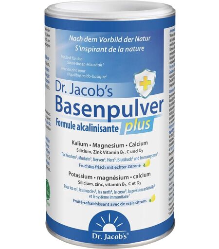Equilibre acido-basique à l’image de la natureLe saviez-vous? Seuls environ 10% des Allemands consomment les 5 portions quotidiennes de fruits et légumes recommandées. Les légumes et les fruits sont riches en minéraux essentiels, comme le potassium, le calcium et le magnésium, mais contiennent peu de sodium.Dr. Jacob’s Formule alcalinisante plus s’inspire de la nature. Il associe des minéraux organiques sous forme de citrate et de lactate, avec un rapport naturel de calcium à magnésium d’environ 3:2, une quantité élevée de potassium et peu de sodium. Enrichi en zinc, il soutient votre équilibre acido-basique.*1 portion (6 g) de Dr. Jacob’s Formule alcalinisante plus offre un pouvoir alcalinisant équivalent à celui de 800 g de fruits et légumes, selon l’indice PRAL (charge acide potentielle pour les reins). Avec une seule mesurette, vous pouvez compenser la charge acide généralement apportée par l’alimentation.*Rabenberg, Mensink (2011): – RKI (éd.): GBE kompakt 2; 6.****Remer, Manz (2003): Am J Clin Nutr, 78(4), 802-3.Le compagnon idéal pour votre régime avec du vrai citronDr. Jacob’s Formule alcalinisante plus est agrémenté d’une touche de citron et délicatement sucré à l’extrait de stevia.** Les personnes au palais fin peuvent détecter le goût du potassium qu’il contient. Mélangé à de l’eau gazeuse, il révèle toute sa fraîcheur.Dr. Jacob’s Formule alcalinisante plus n’est pas seulement le compagnon idéal pour un régime, c’est aussi une excellente boisson isotonique. Une simple mesurette dans un litre d’eau ou de jus de légumes suffit à recharger votre corps en minéraux après l’effort.Renforcez votre système immunitaire – restez en bonne santé et plein de vitalitéAvec l’âge, il devient de plus en plus essentiel de s’assurer d’un apport suffisant en nutriments. Les micronutriments clés pour l’immunité, tels que la vitamine C, la vitamine D et le zinc, jouent un rôle central à cet égard.*40 bienfaits prouvés pour votre santéLes micronutriments contenus dans Dr. Jacob’sFormule alcalinisante plus apportent 40 bienfaits prouvés pour votre santé, contribuant notamment aux fonctions suivantes de l’organisme:Métabolisme acido-basique – zincSystème immunitaire – vitamine D, vitamine C, zincSanté des os et des dents – calcium, magnésium, vitamine DSystème nerveux (potassium, magnésium), transmission des signaux entre les cellules nerveuses – calciumFonction musculaire– potassium, magnésium, calciumMaintien d’une pression sanguine normale – riche en potassium, pauvre en sodiumFonction cardiaque– vitamine B1Métabolisme énergétique et réduction de la fatigue – magnésiumSanté de la peau, des cheveux et des ongles – zincParticipe à la division cellulaire – calcium, vitamine DProtection cellulaire contre le stress oxydatif – vitamine CEnzymes digestives – calciumFormation normale du collagène pour assurer la fonction normale de la peau et du cartilage (composants des articulations) – vitamine CFonctions psychologiques (pensée, ressenti, humeur) – magnésiumPour... ...