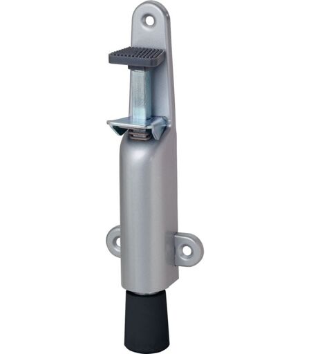 en acier · peint en argent · montage sur porte · distance entre le bas de la porte et le bouchon : 5-10 mm · poids de la porte environ 40 kg · 30x210 mm · profondeur 33 mm · bouchon en caoutchouc noir · le ressort de contre-pression monté en série augmente la pression contre le sol ...