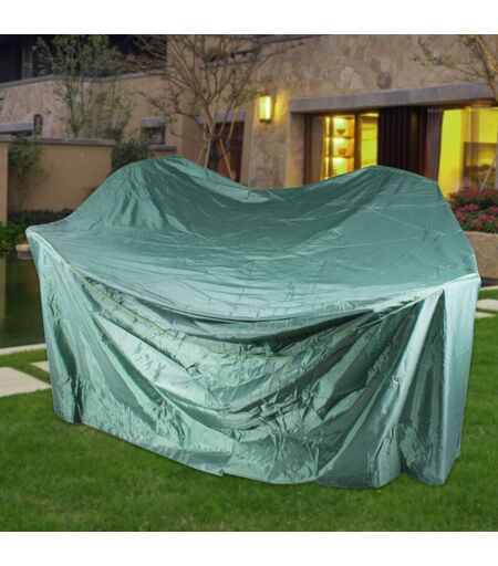 Description Housse de protection pour vos meubles de jardin. Cette housse de protection est fabriquée en polyester vert 420D et convient pour couvrir six chaises à haut dossier et une table ovale. Grâce au choix du matériau, la housse est étanche et protège parfaitement vos meubles de jardin de la poussière, de la saleté et des intempéries. Détails • Type de produit : Housse pour meubles de jardin• Matériau : polyester 420D• Couleur : vert• Longueur x largeur x hauteur en cm : 210 x 250 x 95• poids : 1,5kg ...
