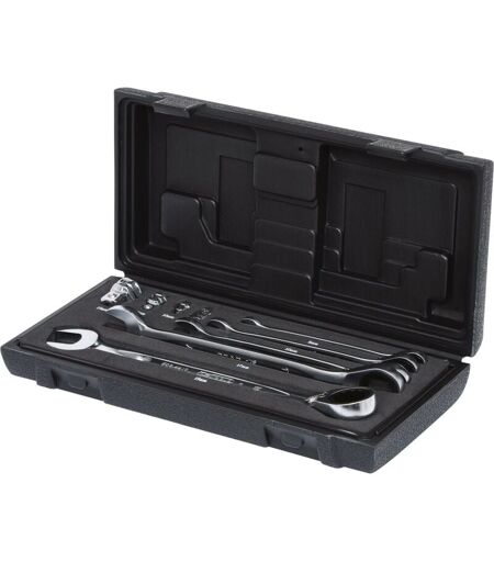 Système FlankTraction Selon DIN 3113 / ISO 3318 Fourche inclinée à 15° Tête de cliquet inclinée à 15° Cliquet précis 72 dents Cliquet réversible Carré d'entraînement avec bille de verrouillage selon DIN 3120 / ISO 1174 Pour embouts DIN 3126 / C 6,3 Finition satinée Chrome Vanadium Coffret robuste en matière plastique Largeur de clé mm 8, 10, 13, 17, 19 Diamètre min. de la clé 8 Dent 72 Pièces dans l'ensemble 9 Poids 1100 Exécution Commutable Attribut de fonction 2 Commutable Accessoires mit Adapter Angle de retour 5 Taille de l'emballage 1 Matériau1 Feinster Chrom Vanadium Stahl, matt satiniert verchromt Forme de la clé Ring 15° gekröpft Contenu 9-teilig Norme DIN 3113, ISO 3318, DIN 3120, ISO 1174 Attribut de fonction 1 Einsatzschnelllösefunktion Profil2 metrisch Profil1 Flank Traction Position des fourches 15° Gabelstellung Emballage Kunststoffkoffer, extra robust Taille max. Ouverture de clé 19 ...