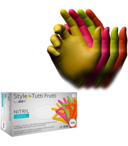 STYLE Tutti Frutti, gant d'examen en nitrile, non poudré, mélange de couleurs. 240 mm de long, non stérile96 pièces - 24 pièces de chaque en jaune, vert pomme, orange, magentaAQL 1.5, EN ISO 21420, EN 455, EN 374 ...