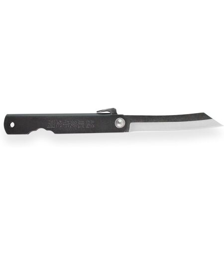 L'Higonokami : un couteau de poche qui sort de l'ordinaire ! Forme de lame Tanto inversée : style sabre japonais Lame en acier inox japonais 7Cr17 : dureté 58 HRC Déploiement manuel de la lame : pression du pouce sur le levier Manche façonné en acier noir avec dragonne ...