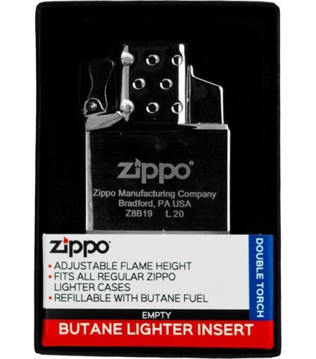 Briquet Zippo® 2 jets. Cet insert double jet Zippo® est compatible avec tous les briquets à essence Zippo, à l'exception des modèles Slim. Il s'active grâce à un bouton piézoélectrique classique. La flamme est réglable et atteint des températures allant jusqu'à 1260 °C. Ces inserts sont neufs, vides et doivent être utilisés avec du butane dans leur emballage Zippo® d'origine. ...