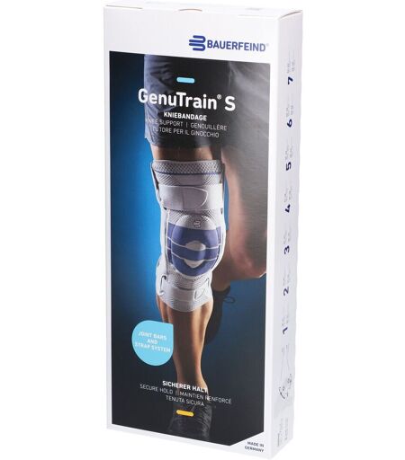 En cas d'instabilité du genou de légère à modérée, la GenuTrain S est exactement l'aide thérapeutique qu'il faut. Les renforts latéraux articulés guident votre genou dans le bon axe de mouvement. En parallèle, le tricot Train élastique exerce, lors du mouvement, un massage utilisant différentes variations de pression favorable à la guérison. Cela permet d'activer les muscles de la jambe, de façon à ce que votre genou redevienne vite stable.BénéficesNiveau élevé de stabilité latéraleProtection complémentaire depuis l'extérieurProtection face aux mouvements douloureuxIndicationInstabilité des ligaments latérauxGonarthroseArthrites (par ex. polyarthrite rhumatoïde)ApplicationTailleTour cuisse HautTour cuisse Bas138-41 cm28-31 cm241-44 cm31-34 cm344-47 cm34-37 cm447-50 cm37-40 cm550-53 cm40-43 cm653-56 cm43-46 cm756-59 cm46-49 cm ...