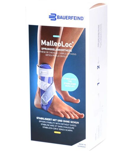 MalleoLoc protège, à l'aide d'une glissière en plastique asymétrique, de manière fiable face à une torsion vers l'extérieur et vers l'intérieur, et ce même pendant le sport. Elle se situe devant la malléole externe et derrière la malléole interne et fait pas directement pression sur la malléole. Une languette saillante stimule les muscles de votre pied et contrecarre les faux mouvements, ce qui stabilise activement la cheville.BénéficesProtège des torsions, même en cas de mouvements brusques et puissantsStabilise l'articulation tibio-tarsienne avec et sans chaussureSoutient le déroulement naturel du pied pour la mobilisationIndicationThérapie fonctionnelle précoce en cas de clessure des ligaments externes de la chevilleProtection post-opératoire après suture / reconstruction du ligamentInsuffisance chronique du ligamentThérapie conservatrice en cas de torsions de la cheville et de ruptures de ligaments gravesElongations ligamentairesPrévention des distorsions, par exemple, en cas de sollicitation sportiveStabilisation de la cheville en balnéothérapie pour séquelle d'hémiplégie non spastiqueApplicationTailleLargeur du talon1< 6 cm2> 6 cm ...