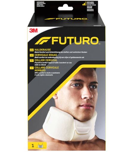 NIVEAU DE SUPPORT: MODÉRÉ – STABILISANT Une blessure au cou peut complètement bouleverser votre vie. Le collier cervical FUTURO™ fournit le soutien dont vous avez besoin afin que vous puissiez redevenir vous-même. Fabriquée à partir de mousse douce, cette minerve concilie un soutien essentiel et un confort apaisant. Des sangles ajustables vous permettent de personnaliser la hauteur et de l’ajuster à votre cou. Un matériau en tricot doux recouvre le support pour un meilleur confort, et la conception respirante vous permet de rester au frais. Que vous ayez eu un accident de voiture ou que vous ayez atterri au mauvais endroit dans votre cours de guerrier ninja, faites confiance au support sérieux du collier cervical FUTURO™. Sangles réglables en hauteur et en circonférence. La jugulaire règle la hauteur du col pour plus de confort et d’ajustement. Mousse respirante recouverte d'un tricot doux et lisse. Bénéfices Fournit le confort requis et aide à soutenir un cou raide ou blessé Indiqué pour: Lors d’une utilisation selon la prescription de votre médecin: nerfs coincés ou raideur du cou. Confort requis après une blessure par coup du lapin. Réglable en circonférence et en hauteur pour un ajustement personnalisé Confortable pour une utilisation de jour ou de nuit Matériau respirant Réglable Conception par notre groupe d’experts composé d’ingénieurs et de professionnels de la santé Lors d’une utilisation selon la prescription de votre médecin: nerfs coincés ou raideur du cou. Confort requis après une blessure par coup du lapin. Caractéristiques spécifiques Sangles pour ajuster la hauteur et la circonférence. La sangle jugulaire ajuste la hauteur du collier pour apporter confort et ajustement sur mesure Mousse respirante recouverte d’un tricotage doux et lisse Facile à mettre et enlever. Dimensions: Réglable 27,9 – 50,8 cm Indications Coup du lapin Raideur Nerfs coincés Soulage la douleur légère et les raideurs de cou Conseils d'utilisation Pour positionner, tenir le collier à deux main, le rabat de la sangle jugulaire centrale face à vous vers l’extérieur et dans la main droite la sangle de fermeture « extérieure » du collier. Placer le collier devant le cou, la sangle jugulaire centrée sous le menton. Refermer le bord gauche du collier à l’arrière du cou, et le fixer sur le bord opposé. Ensuite positionner le côté gauche doux sous ou contre le côté droit et fixer fermement la sangle sur le la bande auto agrippante . Ajuster jusqu’à obtenir un maintien ferme mais confortable. Tenir le collier bien en place, désengager la sangle jugulaire sous le menton. Serrer ou déserrer la sangle jugulaire jusqu’à obtenir un soutien ferme mais confortable sous le menton. Re fixer la bande auto agrippante. Instructions de nettoyage pour les bandages FUTURO™ Lavage à la main jusqu'à 30 °C L'utilisation d'eau de javel, le séchage en séchoir, le repassage et le nettoyage à sec sont à proscrire Composition Mousse Polyuréthane , modacrylique nylon, coton. Conditionnement 1... ...
