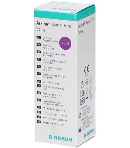 Film barrière Askina Askina® Barrier Film est un pansement liquide stérile qui, après application sur lala peau forme un film transparent. Ce film est incolore, transparent et se caractérise pargrâce à une bonne perméabilité à l'oxygène et à l'humidité.Le film barrière Askina® ne contient pas d'alcool et ne provoque donc pas de sensation de peau piquante ou désagréable.IndicationsPeut être utilisé sur une peau intacte ou endommagéePrévention des dommages cutanés causés par la friction ou l'humiditéProtection de la peau menacée contre la macération et l'excoriationProtection de la peau nouvellement formée contre la décomposition secondaireAgit comme une barrière de protection :Contre l'irritation par les fluides corporelsPour les peaux sensibles et délicatesSous les pansements adhésifs pour réduire les perturbations du tissu nouvellement cicatriséPour les peaux abîméesPour les fissures de la peauPour protéger les zones périurbaines et péristomiquesPour les petites coupes et les fissuresAux points de fixation des tubes de drainage et des cathéters externes.Conseils d'utilisationsPréparation des plaiesNettoyez la peau avec une solution saline stérile (0,9 %) ou une solution de nettoyage appropriée, comme le Pronto-san®, et des chiffons stériles.Séchez soigneusement la peau avant d'utiliser le Film Barrière Askina®.Application du pansement Enlevez le couvercle. Tenir la buse de pulvérisation à 10-15 cm de la peau,appuyer sur la buse de pulvérisation et appliquer un film lisse qui couvre complètement la zone en question. Laissez le film sécher pendant 30 secondes.Appliquer le produit sur les zones qui ont pu être oubliées.Si le film barrière Askina® est appliqué sur une zone présentant des rides ou des frottements de la peau, lissez doucement les rides avec votre main et laissez le film sécher avant que la peau ne reprenne sa position normale.Remettez le capuchon sur la buse de pulvérisation lorsque vous n'utilisez pas le produit.Changer le pansement Askina® Barrier Film peut être retiré avec la plupart des décapants pour adhésifs médicaux, conformément au mode d'emploi.Suivez les instructions 4.1 et 4.2 pour retirerAppliquer une couche de Film Barrière Askina®.CondtítionnementSpray de 28 ml ...