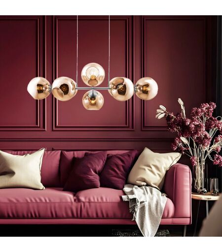 DescriptionCette lampe à suspendre réglable en hauteur se compose d'une suspension en métal nickel mat. Huit abat-jour sphériques en verre ambré, légèrement transparents, sont fixés à une tige droite.L'ampoule est visible à travers les abat-jour transparents, de sorte que les ampoules à filament conviennent particulièrement bien à cette lampe. Grâce à son design, cette lampe à suspendre s'intègre dans presque toutes les pièces de vie au style d'aménagement moderne.Avec une longueur de 100 cm et une hauteur maximale de 150 cm, elle fait particulièrement bien son effet au-dessus de la table dans le salon ou la salle à manger.Équipé de huit douilles E27, vous pouvez installer des ampoules d'une puissance maximale de 40 watts chacune dans le luminaire et déterminer ainsi vous-même la couleur et l'intensité de la lumière. Pour des raisons de longévité et d'économie d'énergie, nous recommandons l'utilisation d'ampoules LED.Les ampoules ne sont pas comprises dans la livraison.Détails du ...
